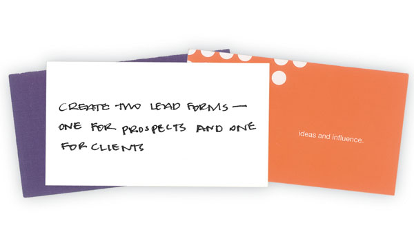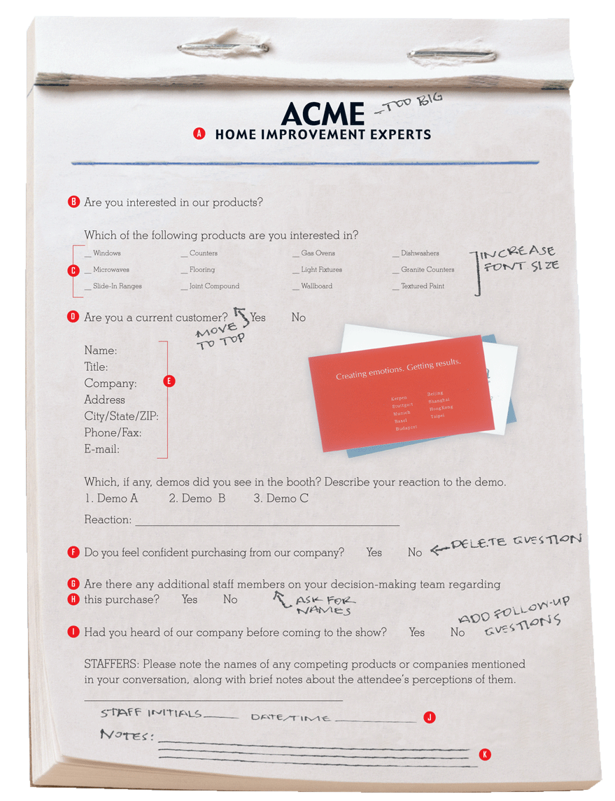 Consider using both sides of the paper if necessary, and using different-colored forms with different questions for different types of attendees. And be sure to use the space judiciously. "There's no reason to have a logo in 72-point font on the top of your lead form," MacLean says.