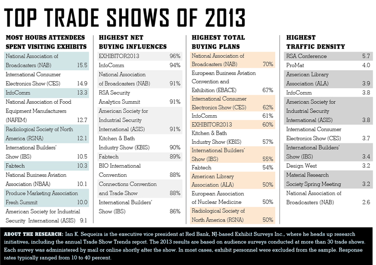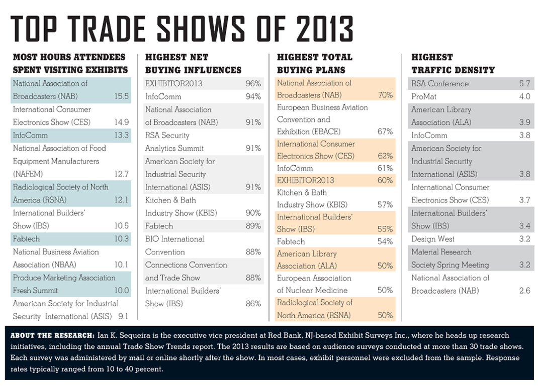 hile 2012 proved to be a year of growth and recovery for the trade show industry, a look back at 2013 indicates last year was more about traction and stabilization. The Great Recession had mostly subsided, but the year didn't include many marketing-industry milestones. Sure, most shows saw at least slight increases in attendance, and several boasted more exhibiting companies and net square footage than in recent history, but significant growth was the exception, while moderate gains were more common.Each year, Red Bank, NJ-based Exhibit Surveys Inc. polls attendees from more than 30 U.S. trade shows to determine the effectiveness of exhibit marketing and indentify industry benchmarks. The company's 2013 Trade Show Trends report includes information about exhibit performance, show-floor traffic, and trade show attendees – their buying power, purchase plans, and attendance habits.