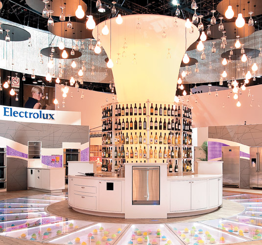 How Sweet It Is AB Electrolux served up a savory space to attendees with a transparent walkway 50 feet in diameter filled with cupcakes; a 16-foot-high, LED-lit fabric cone bejeweled with 240 wine goblets and 80 incandescent bulbs; and video loops of "Cupcake Queen" Kelly Ripa that seamlessly linked the company's ad campaign to the exhibit. While attendees explored the 6,400-square-foot booth, they tested Electrolux's new premium line of 108 appliances and munched on cupcakes fresh from the oven. |