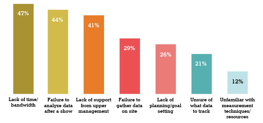 According to the results, more than half of exhibit marketers are less than confident when it comes to their ability to measure their programs' impacts, citing a lack of bandwidth, lack of support, and failure to analyze data after a show as their primary hurdles. And while many are adept at tracking simple metrics, such as badge scans, lead counts, and number of qualified leads, most don't even attempt to gather and evaluate other metrics (such as dwell time or Net Promoter Score) or adopt more advanced measurement techniques (such as Radio Frequency Identification or thermal mapping).