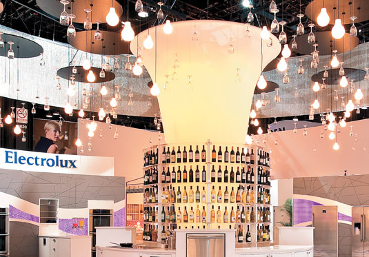 How Sweet It Is AB Electrolux served up a savory space to attendees with a transparent walkway 50 feet in diameter filled with cupcakes; a 16-foot-high, LED-lit fabric cone bejeweled with 240 wine goblets and 80 incandescent bulbs; and video loops of "Cupcake Queen" Kelly Ripa that seamlessly linked the company's ad campaign to the exhibit. While attendees explored the 6,400-square-foot booth, they tested Electrolux's new premium line of 108 appliances and munched on cupcakes fresh from the oven. |